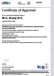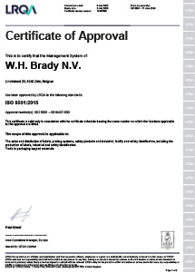 A Brady termékek és megoldások megbízhatóságát belső minőségirányítási rendszerünk támogatja, amelyre vonatkozóan évente megszereztük az ISO 9001 tanúsítványt. A Brady ISO 9001 szabvány követelményeinek való megfelelősége hozzájárul a vevői és szabályozási követelmények teljesítéséhez, a vevői elégedettség javításához, a kockázatok kezeléséhez és a megfelelőség igazolásához.