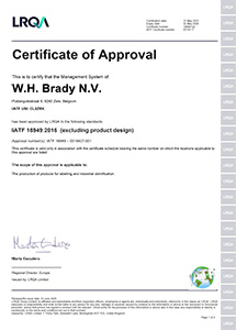 Az ISO 9001 mellett a Brady megfelel az autóipar számára speciális követelményeket támasztó IATF 16949 szabványnak is. Minőségirányítási rendszerünk biztosítja a folyamatos fejlesztést, a hibamegelőzést, az ellátási lánc megbízhatóságát és a hulladékcsökkentést.