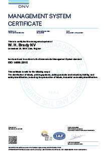 A Brady ISO 14001 tanúsítvánnyal rendelkező környezetirányítási rendszere bizonyítja, hogy törődünk azzal a környezettel, amelyben a Brady tevékenykedik. Szisztematikus megközelítést alkalmazunk a környezetgazdálkodásban, és az ISO 14001 nemzetközi szabványban vázolt módokon hozzájárulunk a fenntartható fejlődéshez.