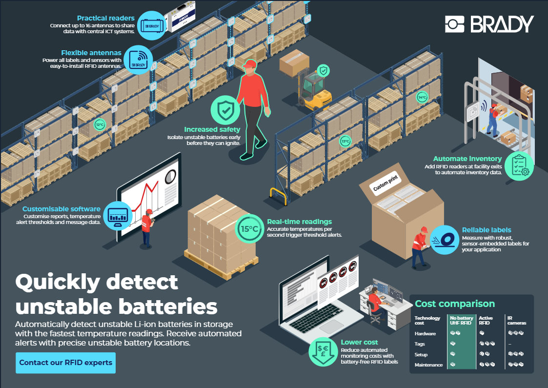 A leggyorsabb hőmérsékletméréssel automatikusan észlelheti a tárolt instabil Li-ion akkumulátorokat. Elkerülheti az üzemszüneteket egy olyan költséghatékony megoldással, amely egyidejűleg lehetővé teszi az akkumulátorok automatikus leltározását is.