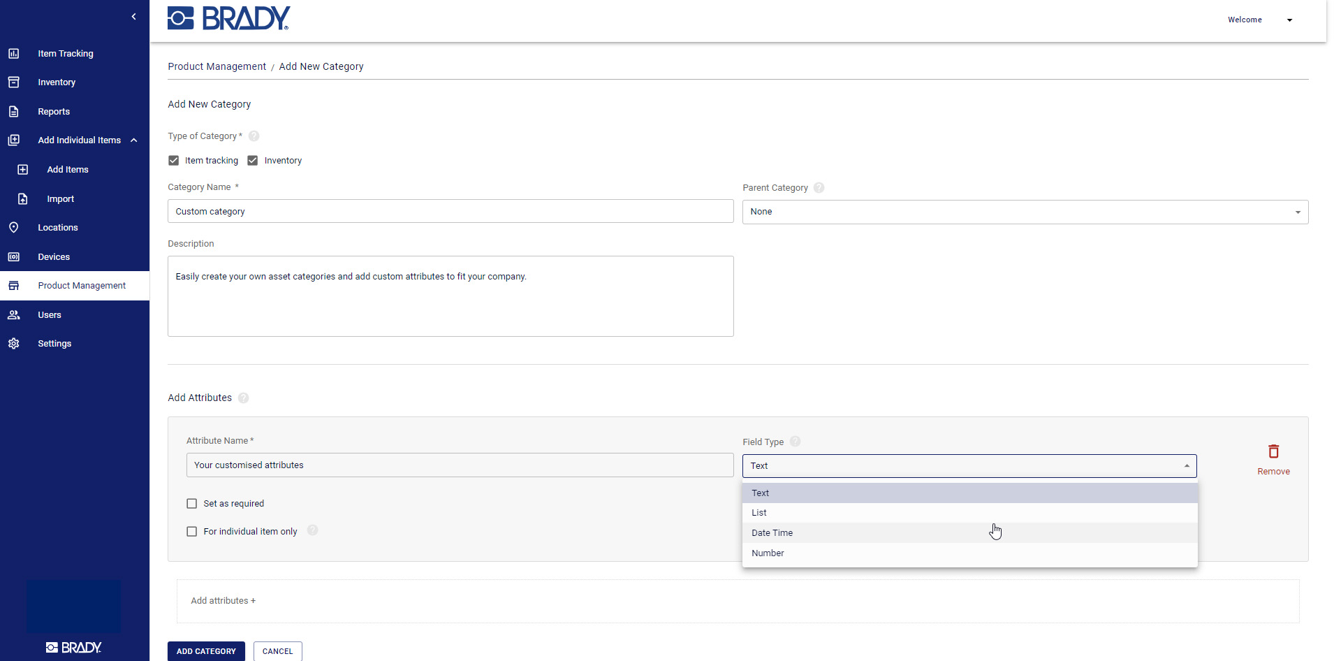 Könnyen importálhat meglévő adatokat, és beállíthat termék-, eszköz- és tételkategóriákat, tételfeltételeket és helyszíneket a rögzített RFID-olvasóknak megfelelően. A beírás után az adatcímkék kategóriánként megjelennek a legördülő menükben, ezzel tovább növelve a beállítási sebességet.